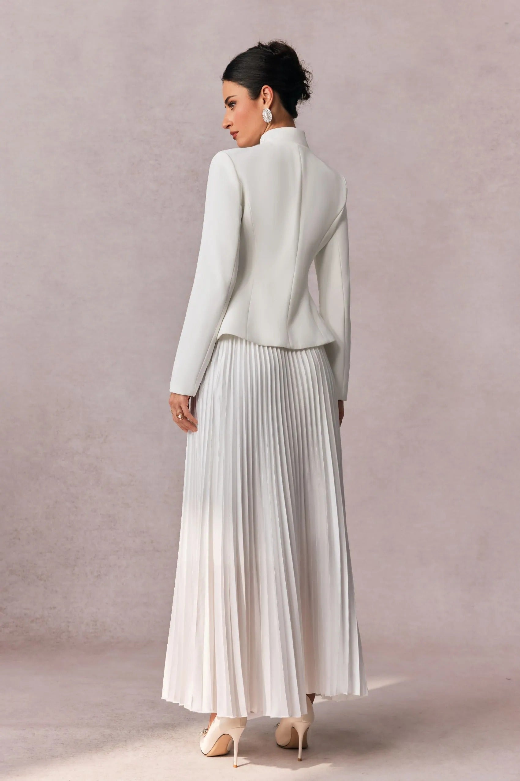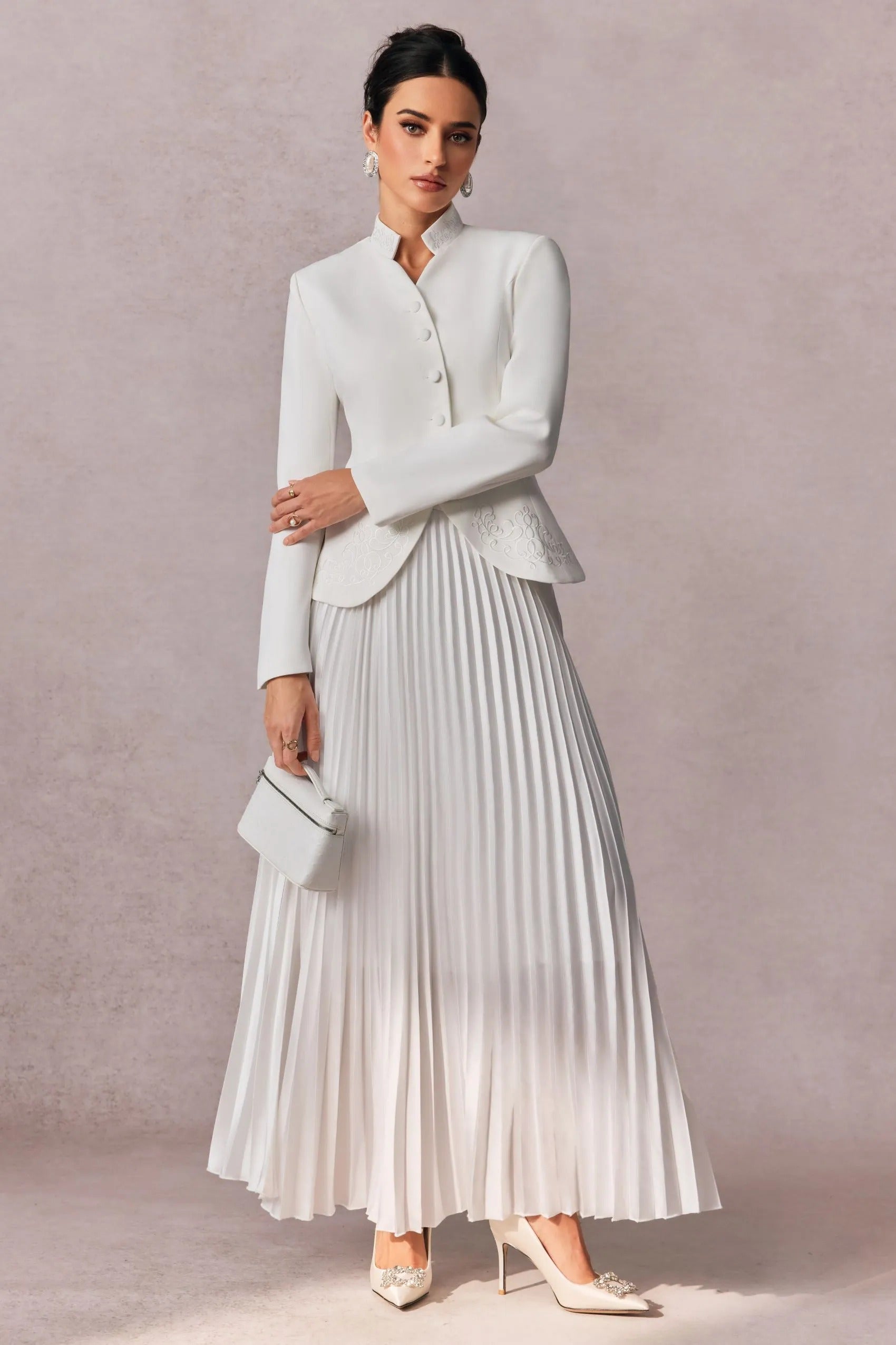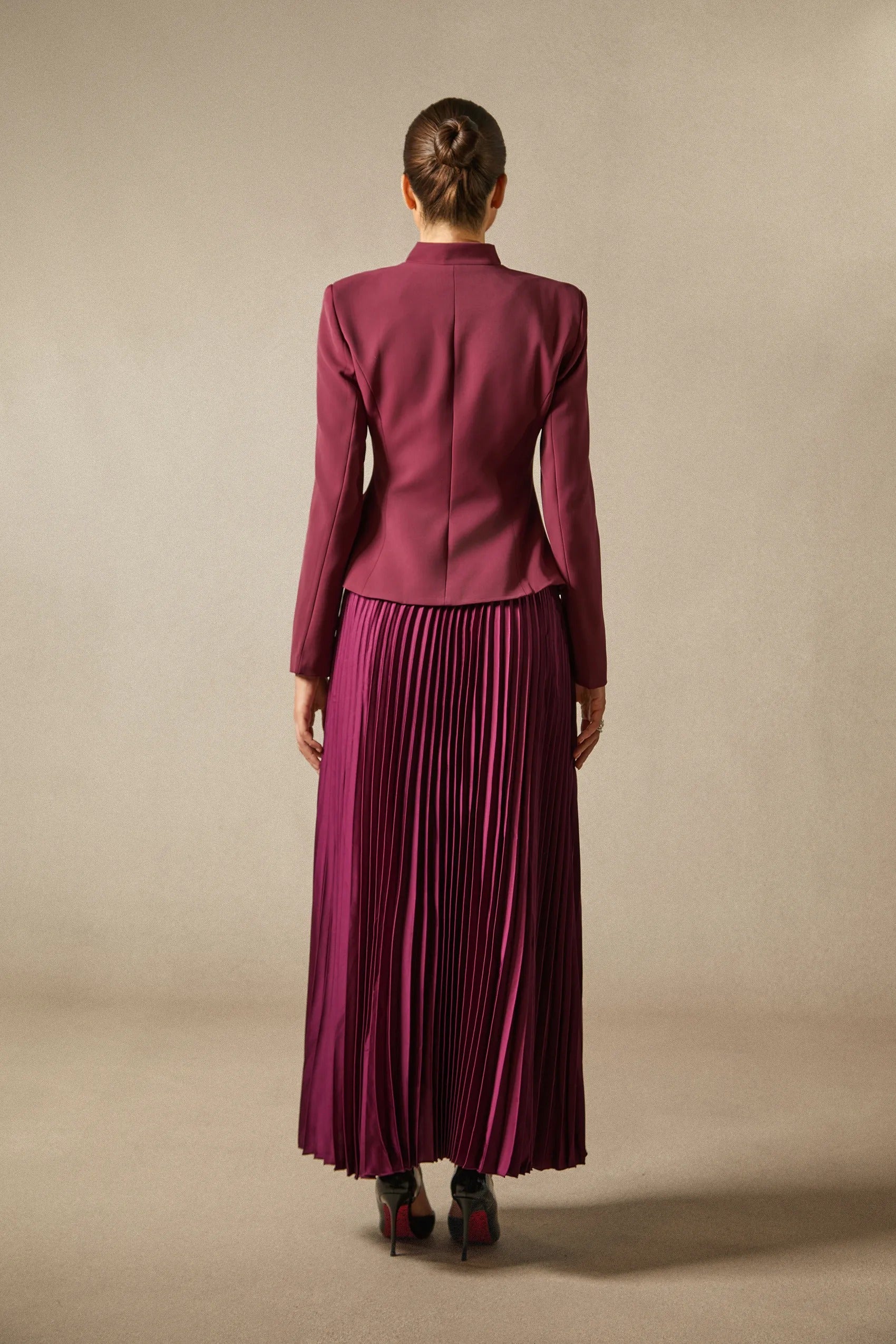 Diseño: Cuello alzado, detalles bordados en el cuello y el cuerpo, dobladillo de blazer estructurado, falda de satén plisada, longitud midi.