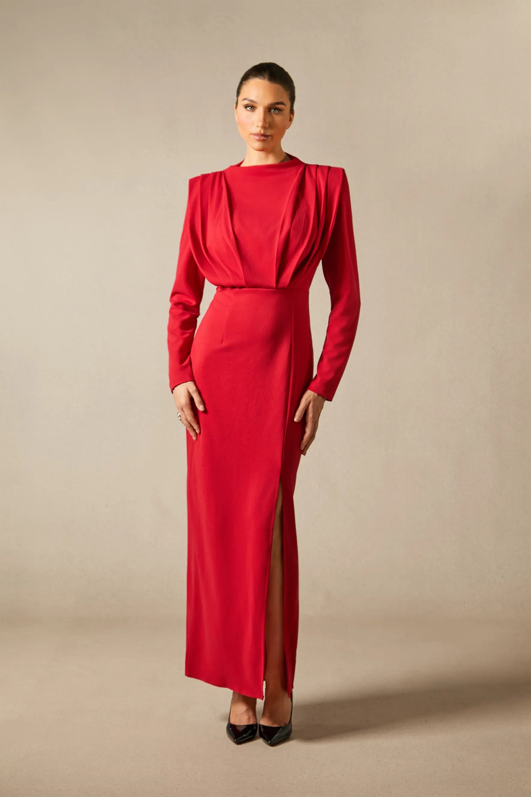 Eleva vestidos de invitada de boda con este maxi de mangas largas que presenta una alta abertura, ofreciendo una cobertura refinada y una elegancia sin esfuerzo para ocasiones formales, asegurando comodidad y una silueta halagadora y sofisticada.
